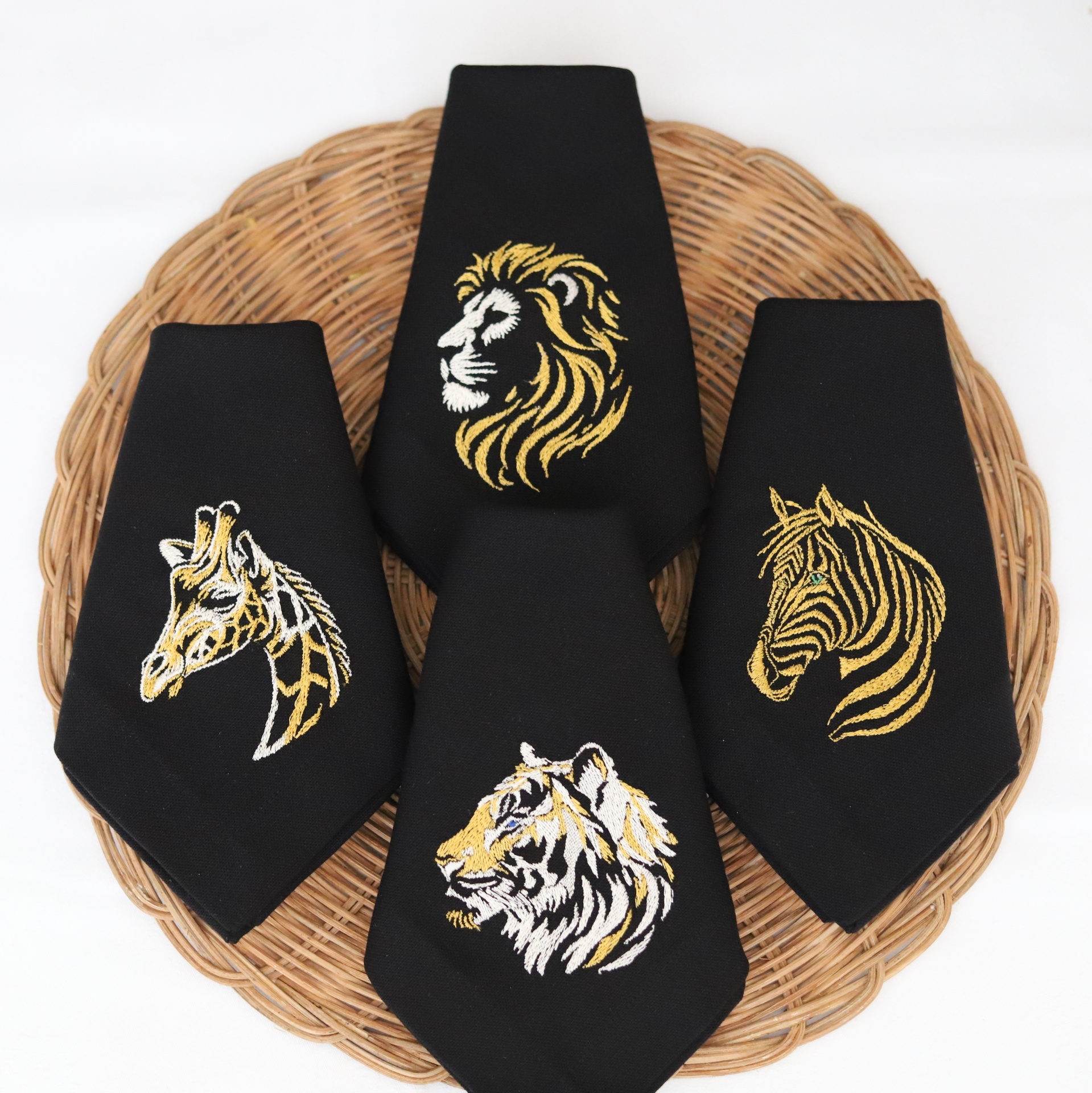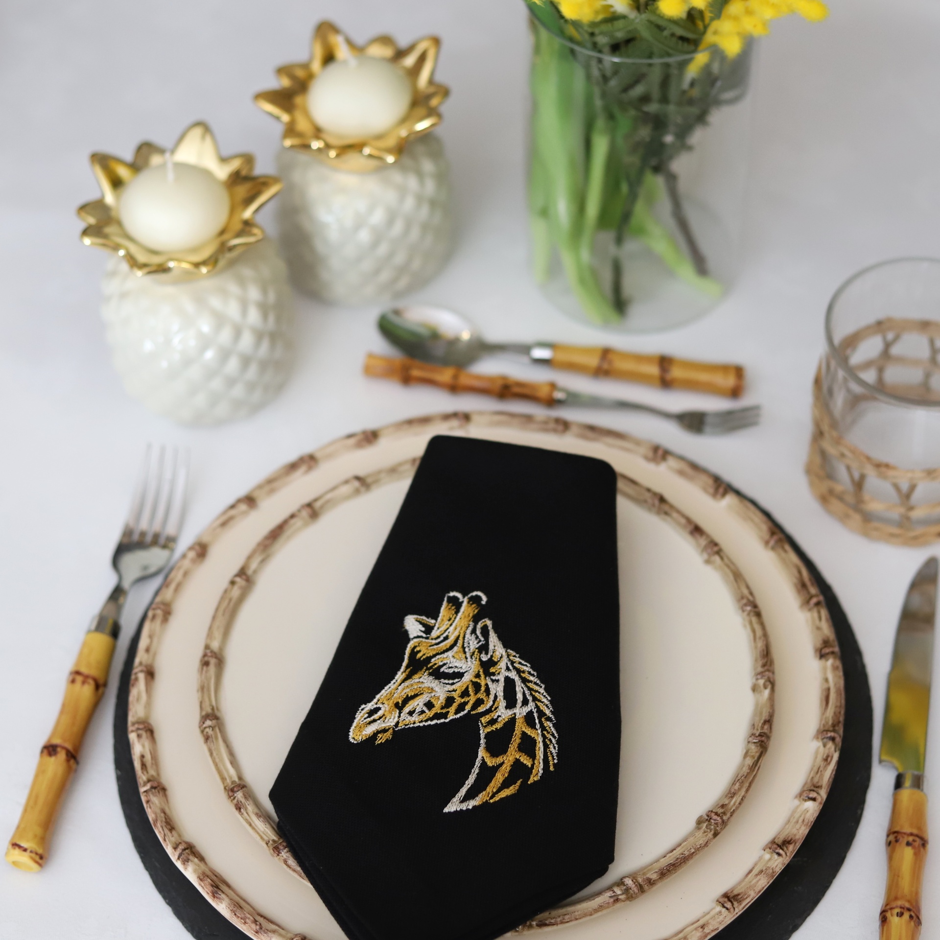 • Guardanapos pretos bordados com animais dourados sobre suporte de verga