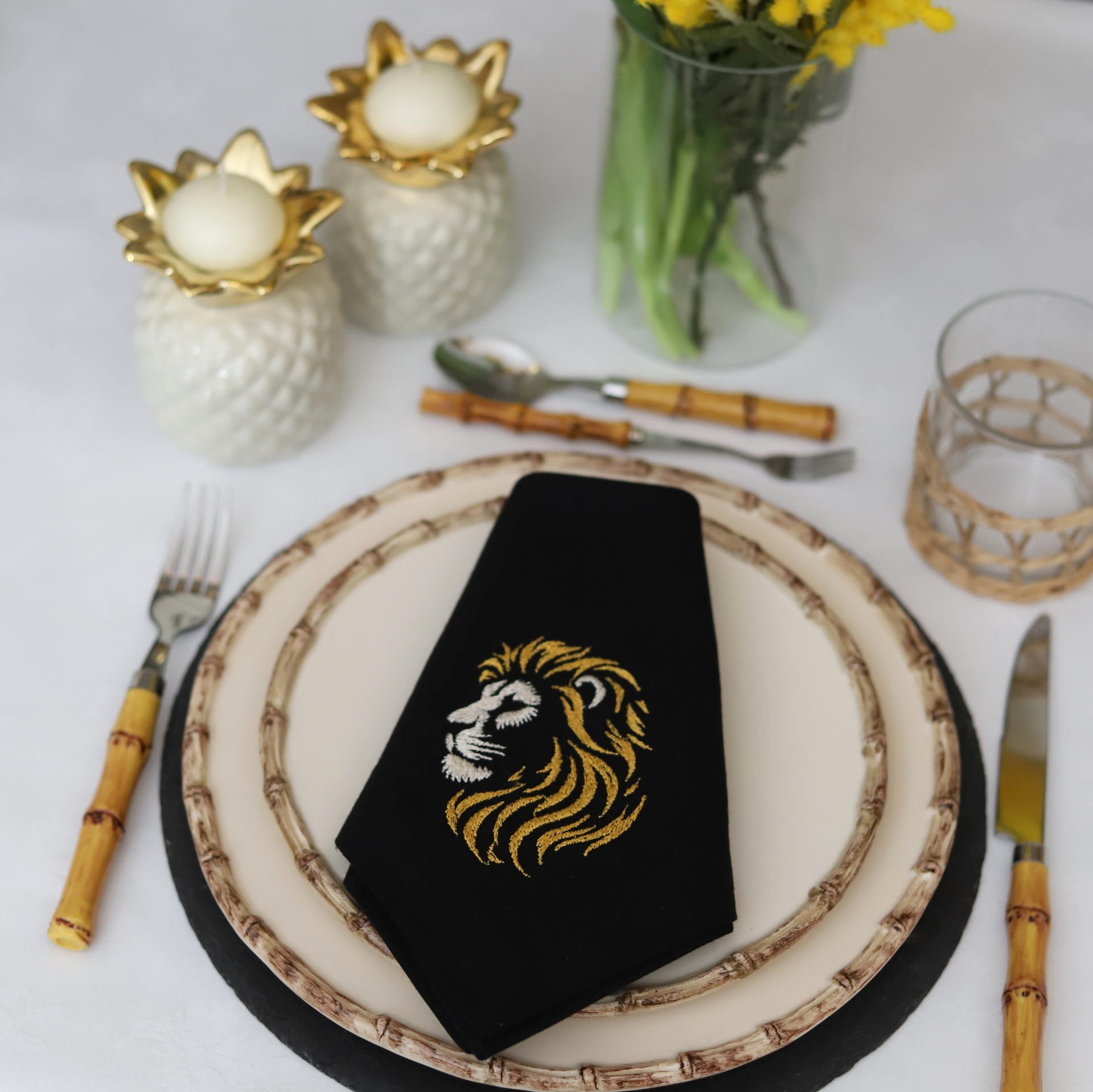 • Mesa posta com pratos, talheres, guardanapo com bordado de leão e castiçais decorativos.