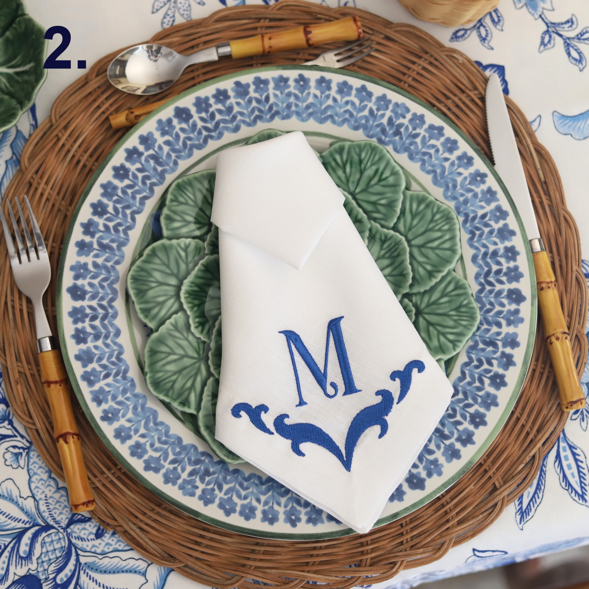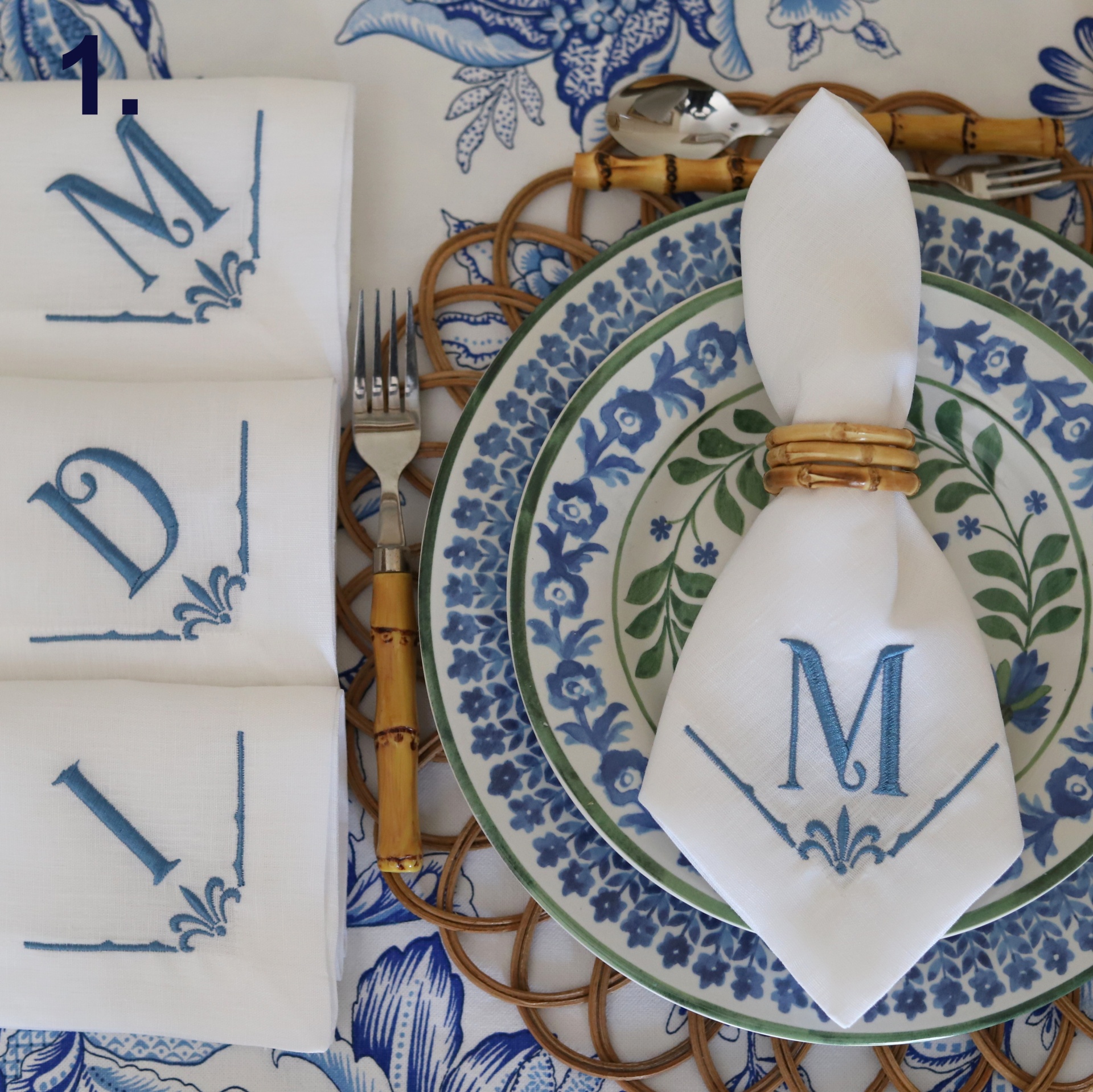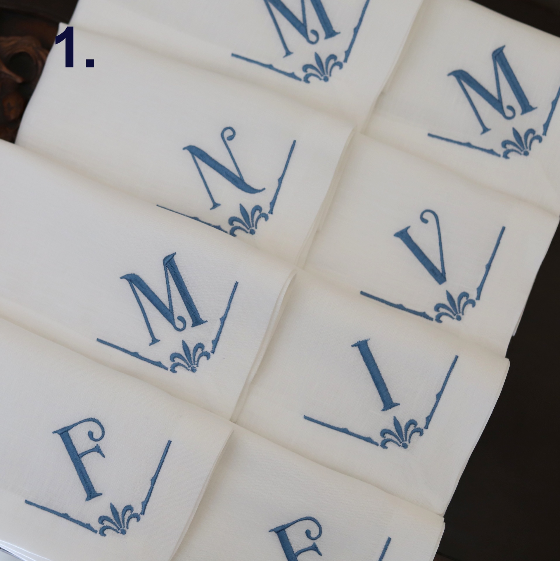 • Guardanapos brancos com letras bordadas azuis em tecido