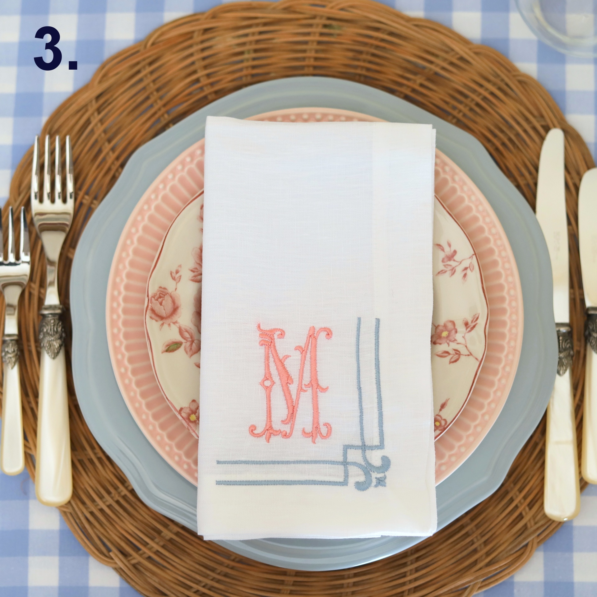 Jogo de guardanapos bordados com letras D, M e L ao lado de prato decorado e guardanapo no centro com anel