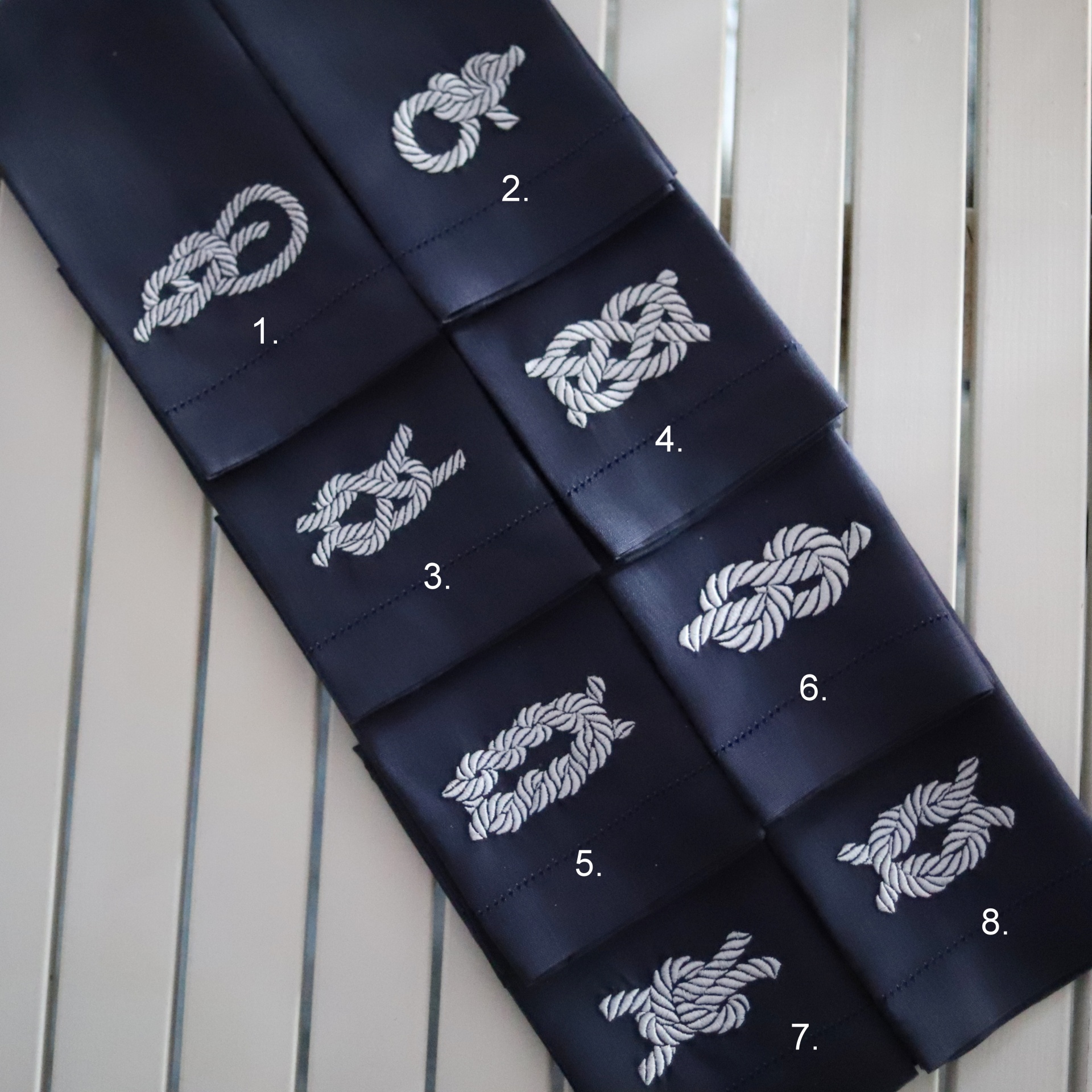 • Oito faixas azuis com nós de corda brancos bordados, numeradas, sobre superfície prateada
