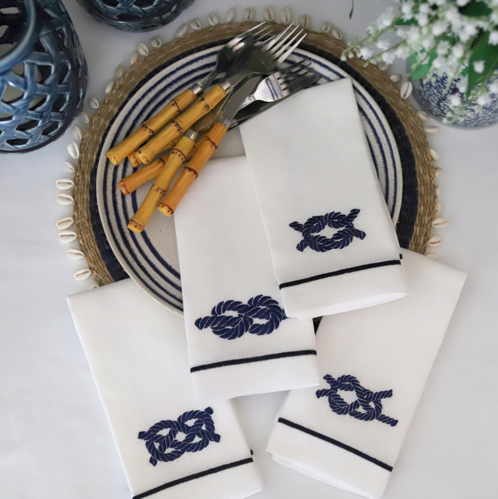 Guardanapos azuis com bordado de nós náuticos, talheres com cabos castanho e objetos decorativos azuis