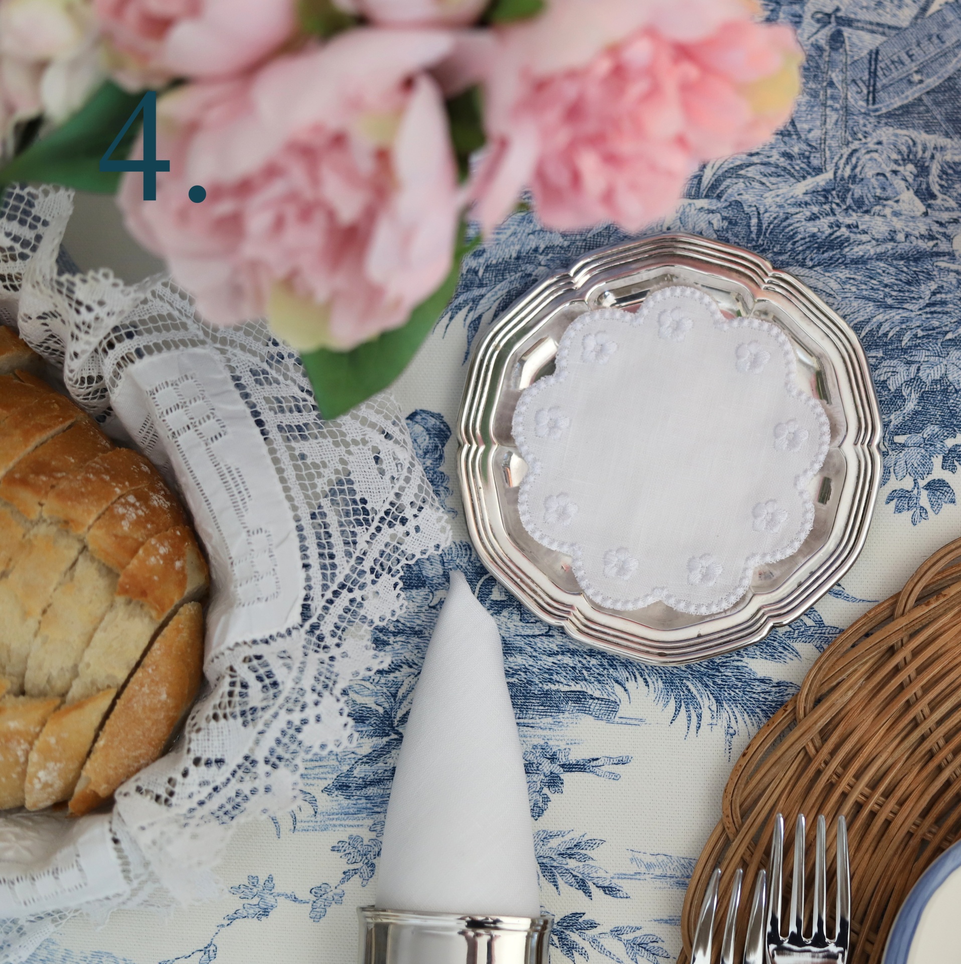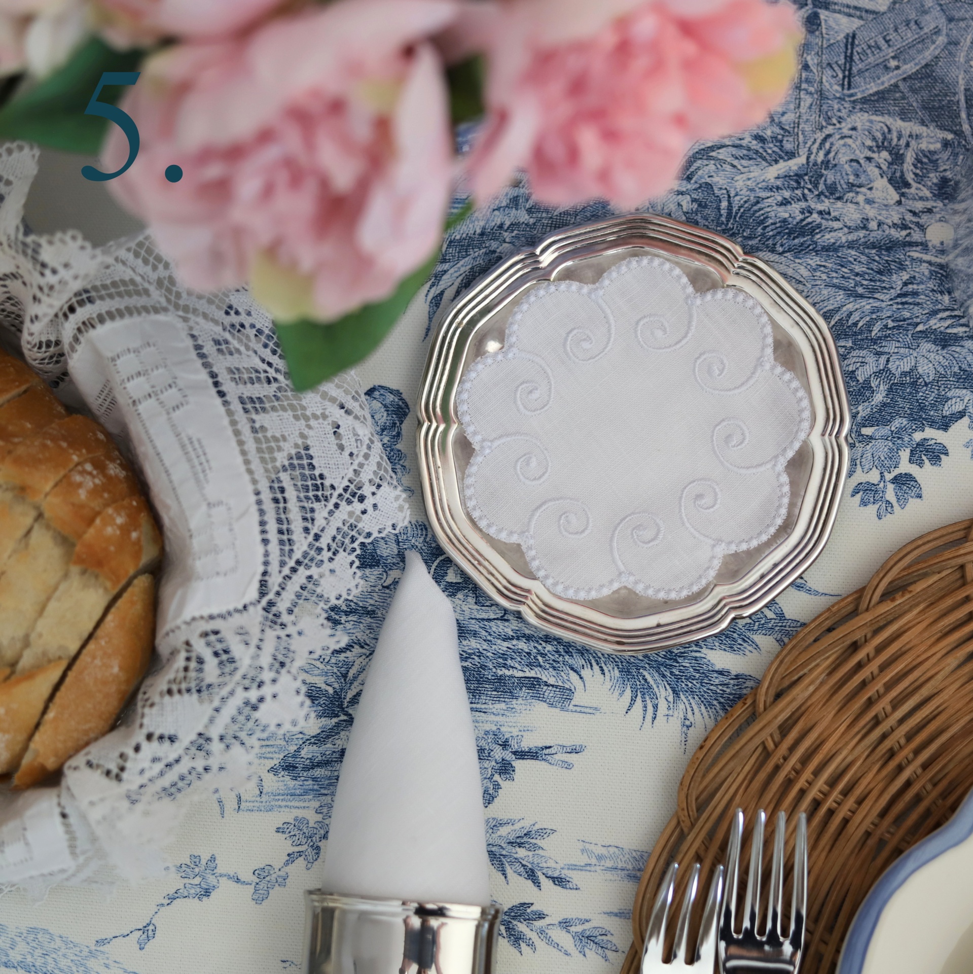 Mesa posta com pão, flor rosa, guardanapo branco, prato prata e toalha azul e branca