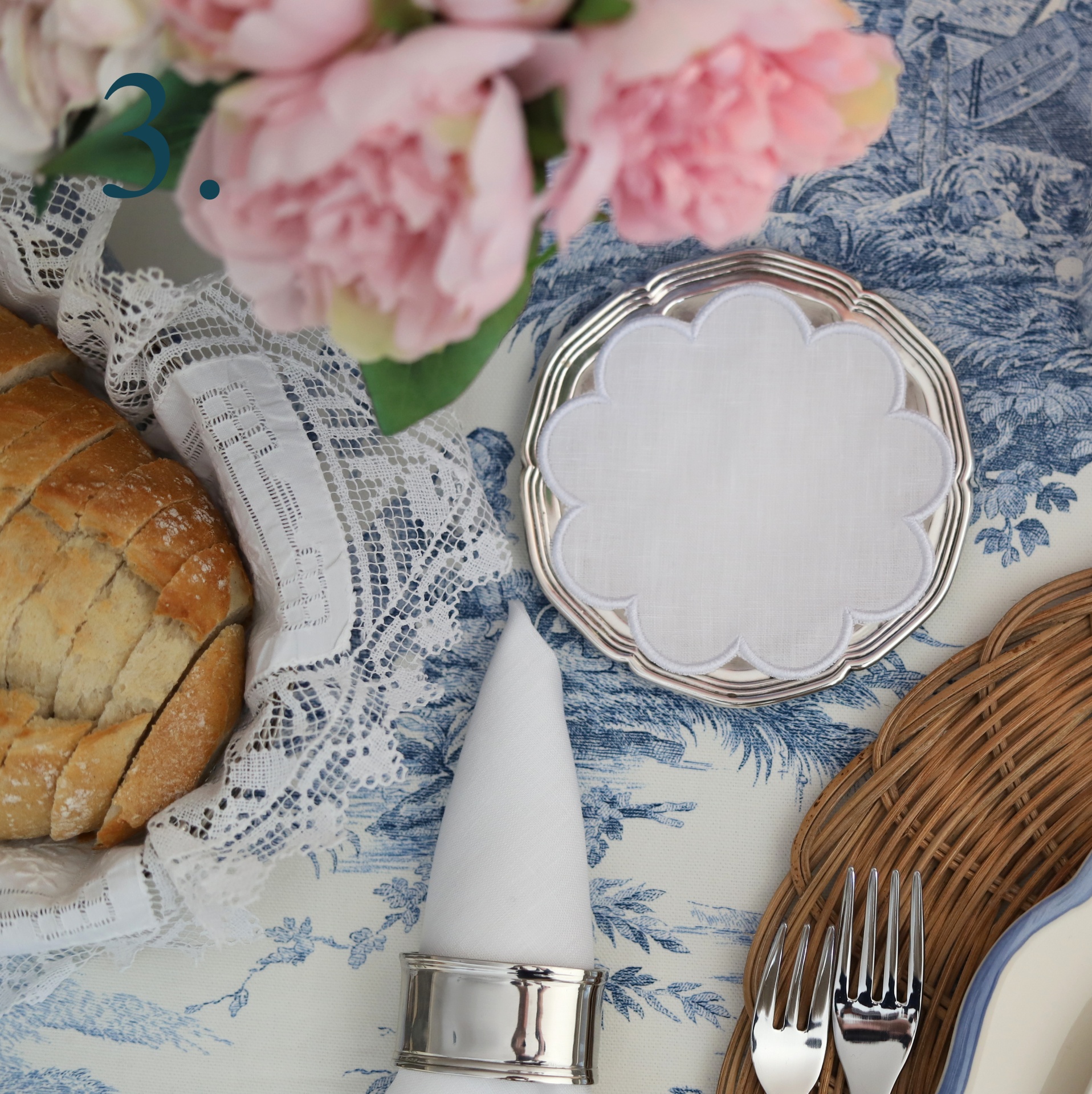 • Mesa posta com pão, guardanapo em suporte prateado, prato de metal, talheres e flores cor-de-rosa sobre toalha azul e branca.
