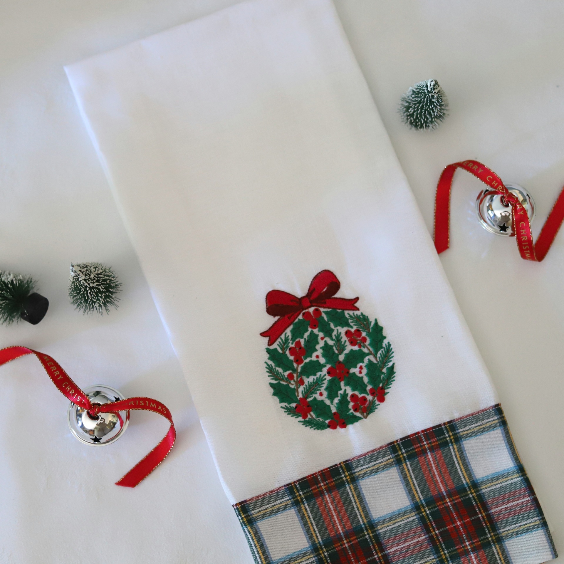 • Toalha branca com bordado natalício e padrão xadrez na bainha.